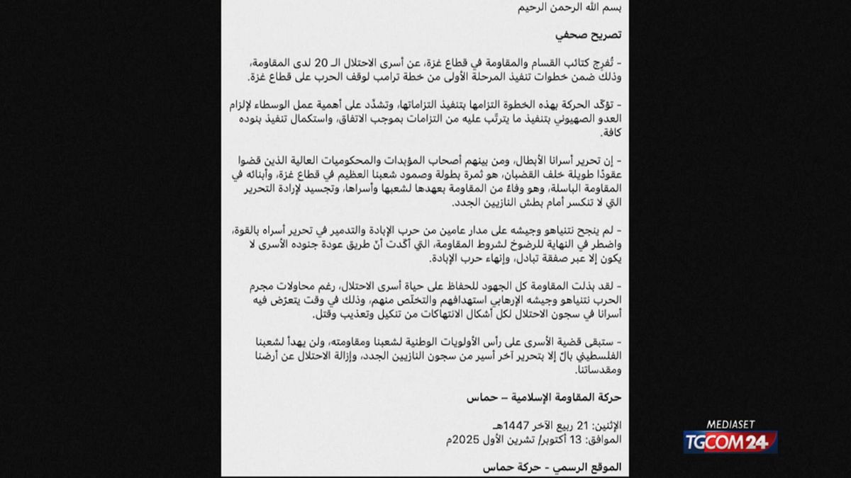 Il 15 marzo 2025, il braccio armato dell’organizzazione islamista palestinese Hamas ha rilasciato una nota ufficiale riguardante lo scambio di prigionieri avviato nella mattinata. In questo comunicato, Hamas ha riaffermato il proprio impegno a rispettare l’accordo per la cessazione delle ostilità con Israele, un’intesa mediata dal presidente degli Stati Uniti, Donald Trump. La dichiarazione sottolinea: “Dichiariamo il nostro impegno all’accordo raggiunto e al rispetto dei tempi stabiliti, fintanto che l’occupazione israeliana farà altrettanto”.