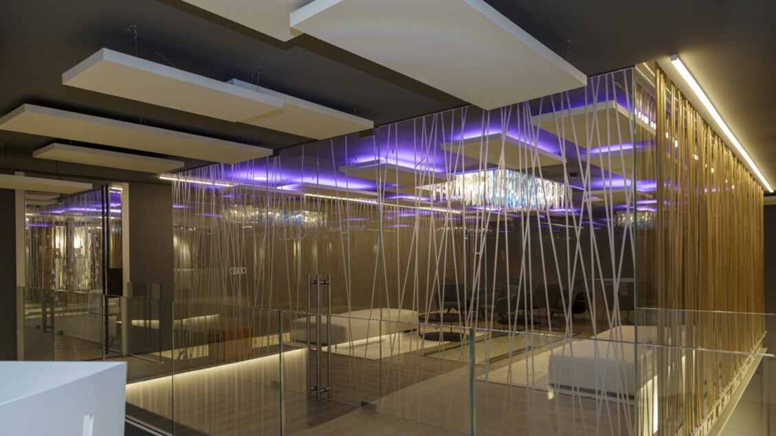 Gli architetti di blueArch hanno creato anche gli arredi, caratterizzati da toni neutri e texture innovative. Ogni dettaglio, dai materiali ai tessuti, è pensato per esprimere un’eleganza discreta, lontana dai cliché tipici di questo tipo di ambienti. Uno degli spazi più distintivi dello Chalet è la Wine-Cellar, concepita interamente in vetro e acciaio, sospesa sopra l’area espositiva e ispirata alle antiche pratiche alpine. Questo salotto per degustazioni e incontri privati offre una vista unica sulla verticalità dell’edificio, accentuando la sensazione di sospensione nel vuoto.